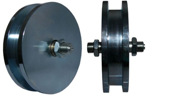 Laufrolle mit Achse und kantiger Nut für handbetriebene, untenlaufende Stahl- oder Holzschiebetore.
